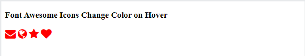This code snippet demonstrates how Font Awesome icons change color to green when hovered over. Four icons - envelope, globe, star, and heart - are displayed using "my-class" styling with a red color. On hover, the color changes to green due to the CSS rule applied using ":hover" pseudo-class. The icons are rendered within the body tag and styled using the provided CSS code.