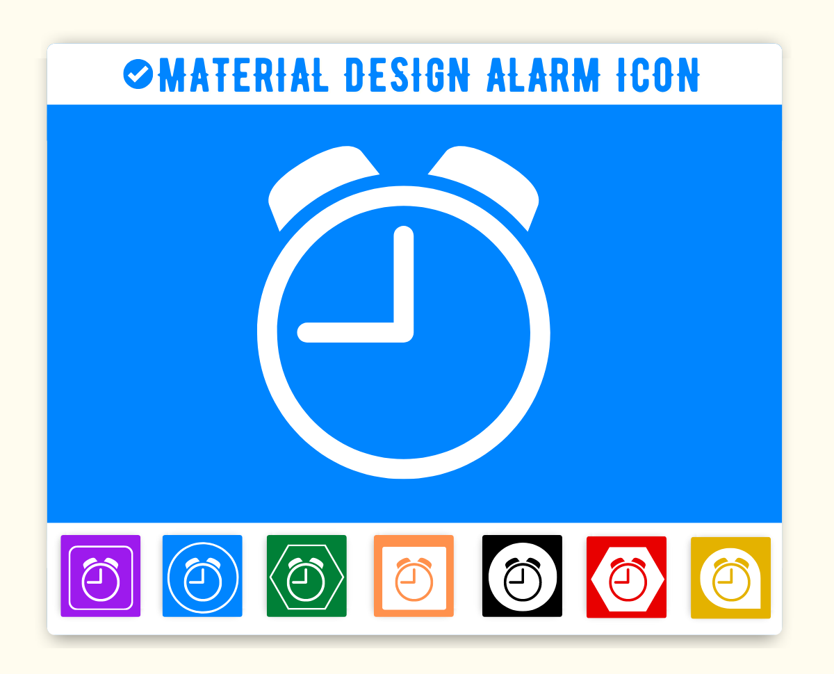 Alarm Icon is given below. You can use this icon on the same way in your project. First make sure you have added Material Icon library. If this library is added just add the HTML css class alarm to any element to add the icon. Material Design Alarm Icon can be resized as per your need. You can manage size of icon(alarm) by using font-size css style.