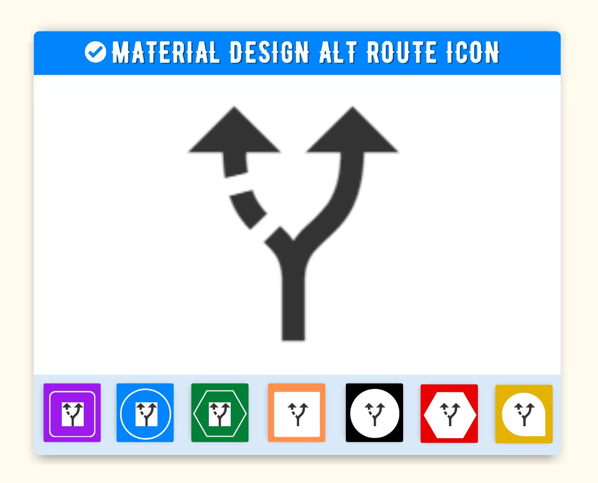 Alt Route Icon is given below. You can use this icon on the same way in your project. First make sure you have added Material Icon library. If this library is added just add the HTML css class alt_route to any element to add the icon. Material Design Alt Route Icon can be resized as per your need. You can manage size of icon(alt_route) by using font-size css style.