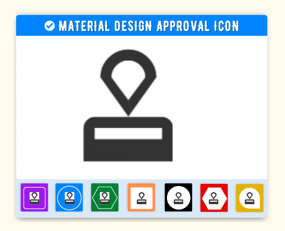 Approval Icon is given below. You can use this icon on the same way in your project. First make sure you have added Material Icon library. If this library is added just add the HTML css class approval to any element to add the icon. Material Design Approval Icon can be resized as per your need. You can manage size of icon(approval) by using font-size css style.