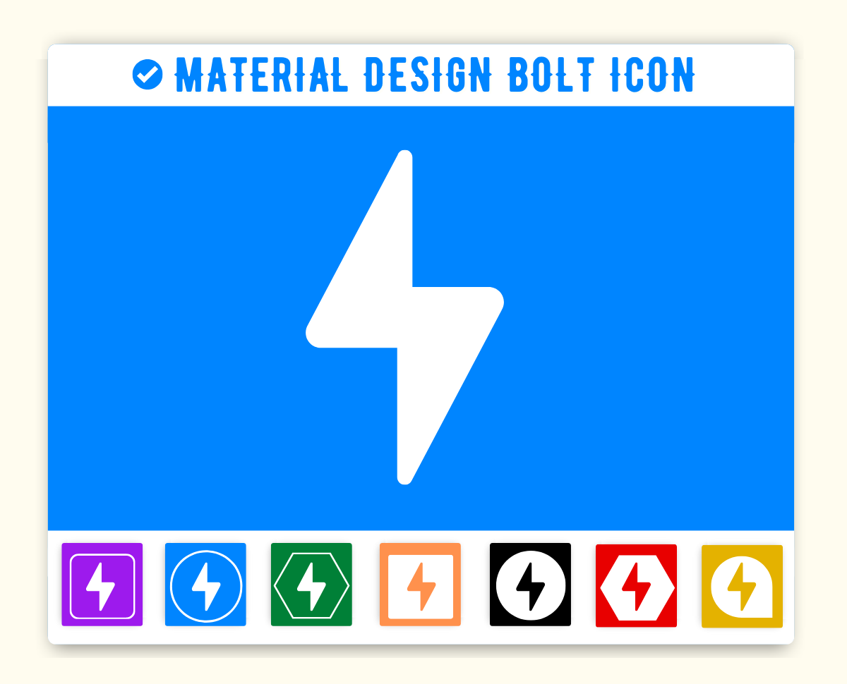 Bolt Icon is given below. You can use this icon on the same way in your project. First make sure you have added Material Icon library. If this library is added just add the HTML css class bolt to any element to add the icon. Material Design Bolt Icon can be resized as per your need. You can manage size of icon(bolt) by using font-size css style.