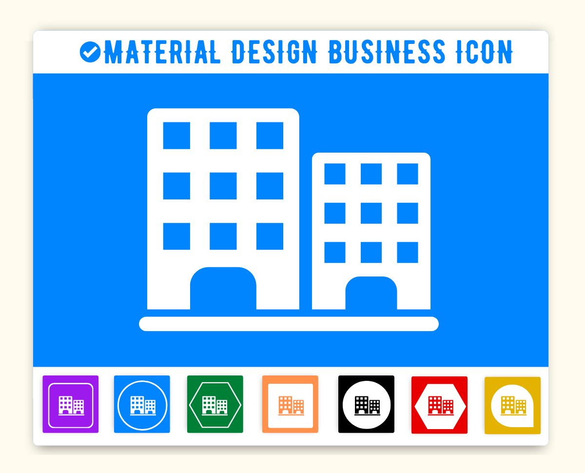 Business Icon is given below. You can use this icon on the same way in your project. First make sure you have added Material Icon library. If this library is added just add the HTML css class business to any element to add the icon. Material Design Business Icon can be resized as per your need. You can manage size of icon(business) by using font-size css style.