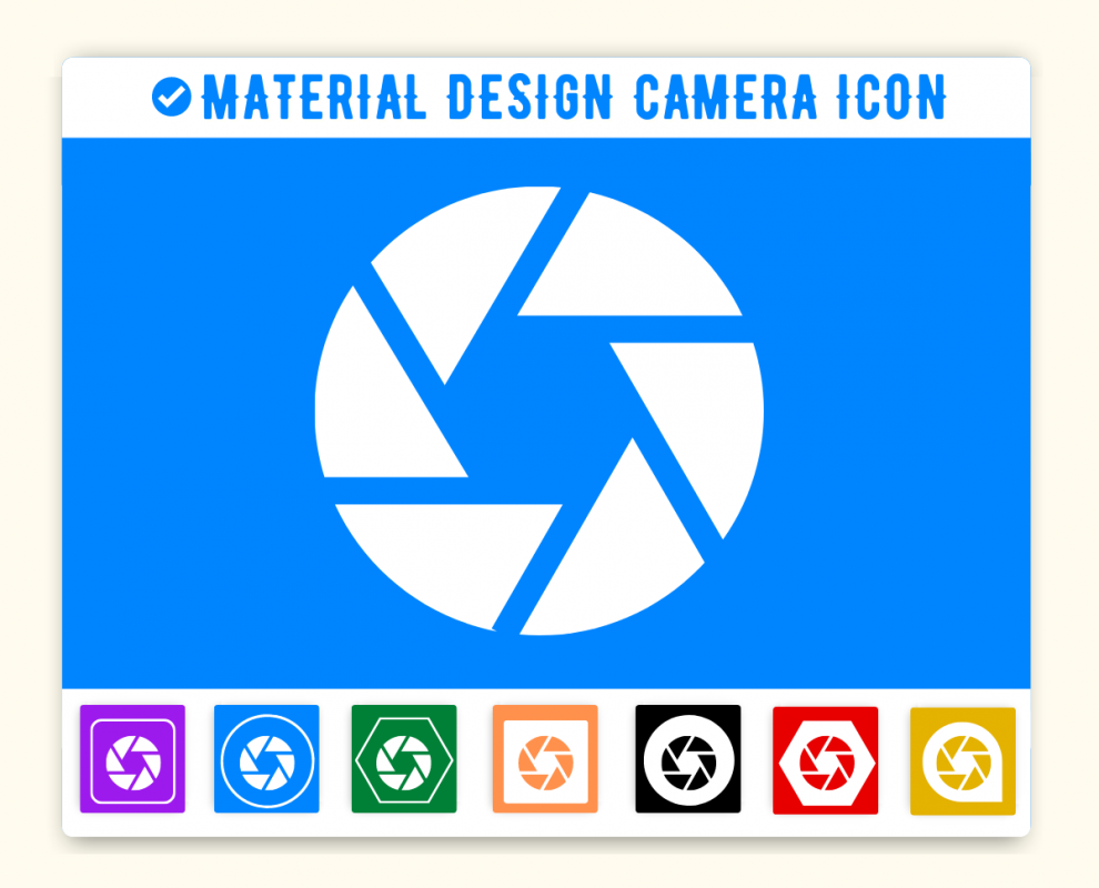 Camera Icon is given below. You can use this icon on the same way in your project. First make sure you have added Material Icon library. If this library is added just add the HTML css class camera to any element to add the icon. Material Design Camera Icon can be resized as per your need. You can manage size of icon(camera) by using font-size css style.