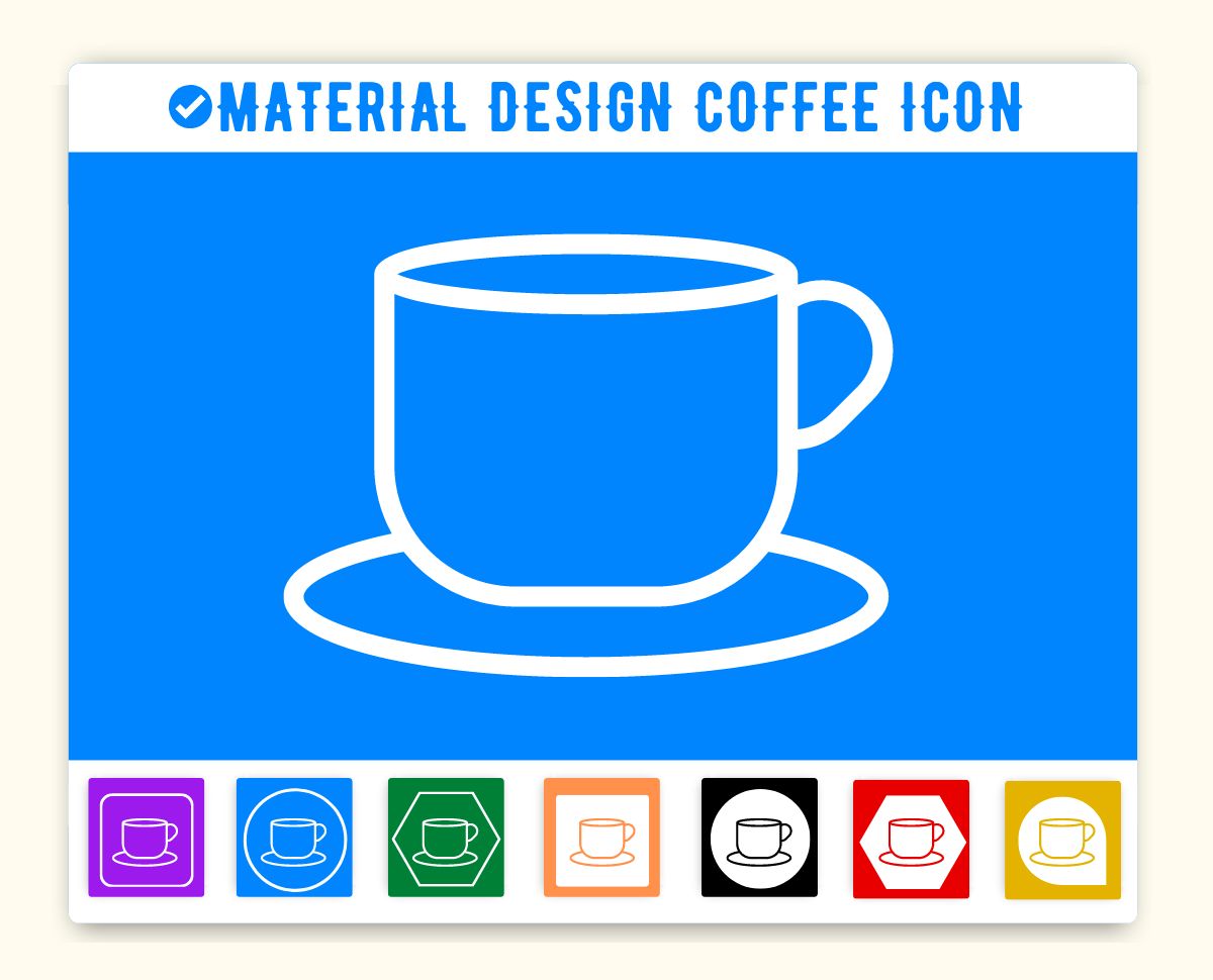 Coffee Icon is given below. You can use this icon on the same way in your project. First make sure you have added Material Icon library. If this library is added just add the HTML css class coffee to any element to add the icon. Material Design Coffee Icon can be resized as per your need. You can manage size of icon(coffee) by using font-size css style.
