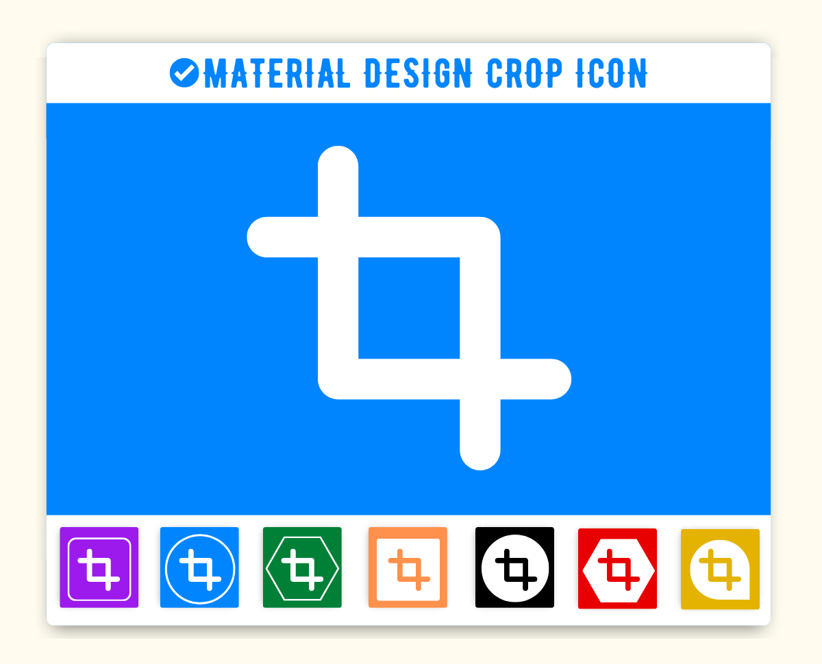 Crop Icon is given below. You can use this icon on the same way in your project. First make sure you have added Material Icon library. If this library is added just add the HTML css class crop to any element to add the icon. Material Design Crop Icon can be resized as per your need. You can manage size of icon(crop) by using font-size css style.