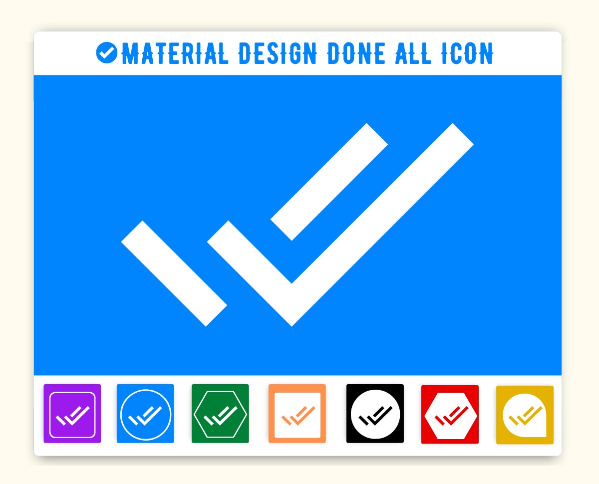 Done All Icon is given below. You can use this icon on the same way in your project. First make sure you have added Material Icon library. If this library is added just add the HTML css class done_all to any element to add the icon. Material Design Done All Icon can be resized as per your need. You can manage size of icon(done_all) by using font-size css style.