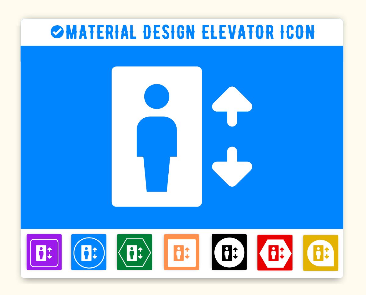 Elevator Icon is given below. You can use this icon on the same way in your project. First make sure you have added Material Icon library. If this library is added just add the HTML css class elevator to any element to add the icon. Material Design Elevator Icon can be resized as per your need. You can manage size of icon(elevator) by using font-size css style.