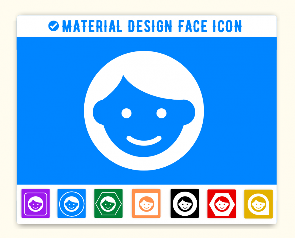 Face Icon is given below. You can use this icon on the same way in your project. First make sure you have added Material Icon library. If this library is added just add the HTML css class face to any element to add the icon. Material Design Face Icon can be resized as per your need. You can manage size of icon(face) by using font-size css style.