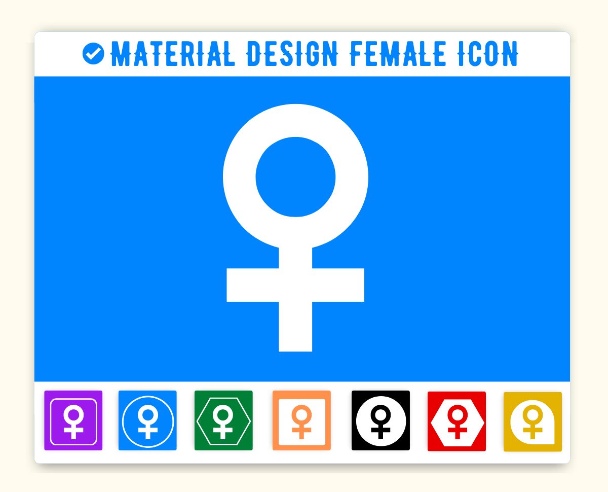 Female Icon is given below. You can use this icon on the same way in your project. First make sure you have added Material Icon library. If this library is added just add the HTML css class female to any element to add the icon. Material Design Female Icon can be resized as per your need. You can manage size of icon(female) by using font-size css style.