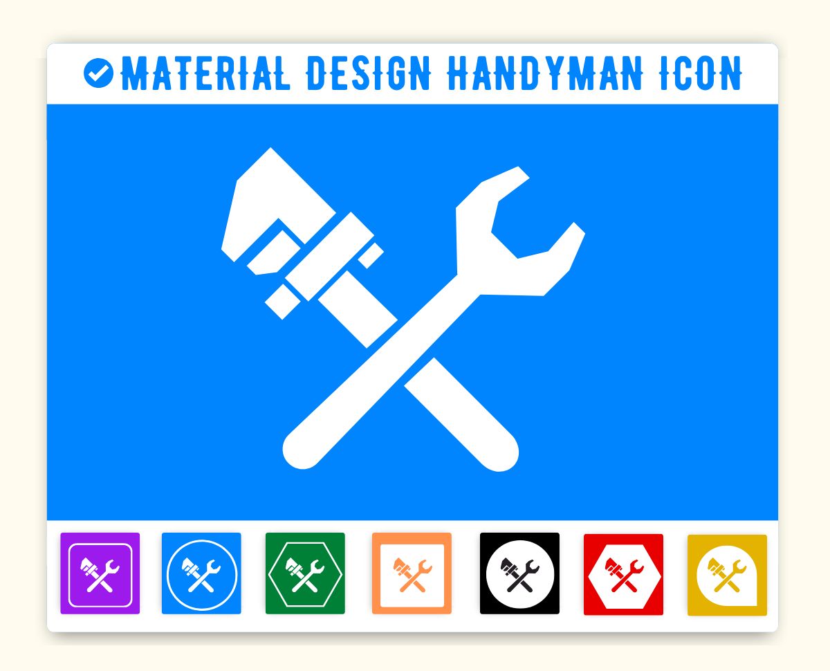 Handyman Icon is given below. You can use this icon on the same way in your project. First make sure you have added Material Icon library. If this library is added just add the HTML css class handyman to any element to add the icon. Material Design Handyman Icon can be resized as per your need. You can manage size of icon(handyman) by using font-size css style.