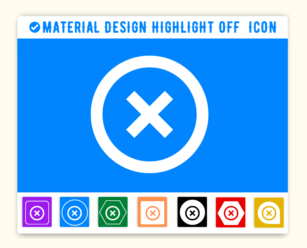 Highlight Off Icon is given below. You can use this icon on the same way in your project. First make sure you have added Material Icon library. If this library is added just add the HTML css class highlight_off to any element to add the icon. Material Design Highlight Off Icon can be resized as per your need. You can manage size of icon(highlight_off) by using font-size css style.
