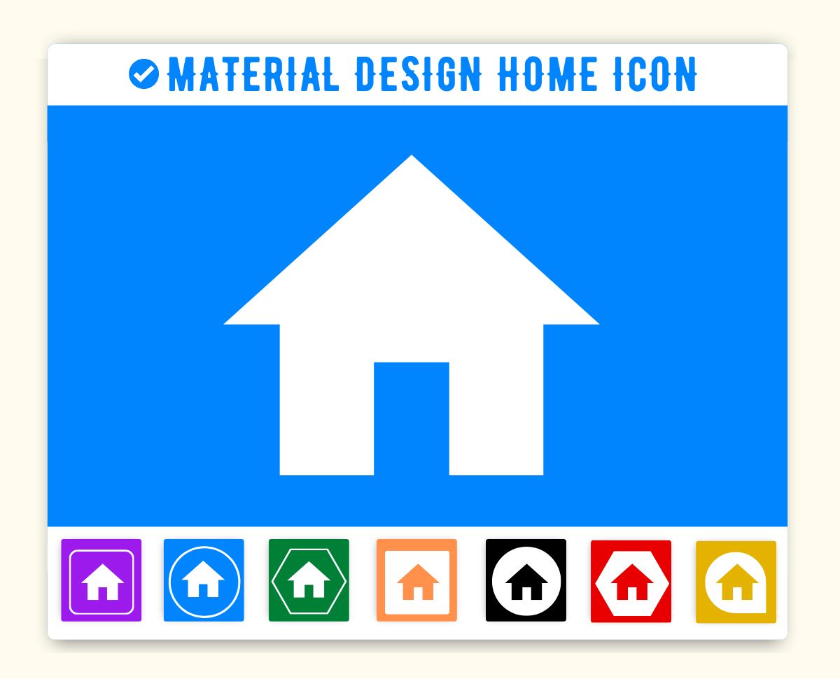 Home Icon is given below. You can use this icon on the same way in your project. First make sure you have added Material Icon library. If this library is added just add the HTML css class home to any element to add the icon. Material Design Home Icon can be resized as per your need. You can manage size of icon(home) by using font-size css style.