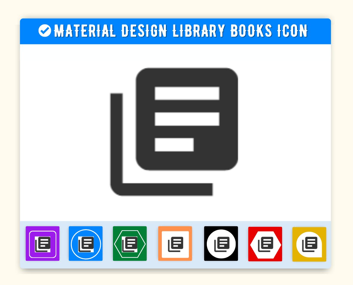 Library Books Icon is given below. You can use this icon on the same way in your project. First make sure you have added Material Icon library. If this library is added just add the HTML css class library_books to any element to add the icon. Material Design Library Books Icon can be resized as per your need. You can manage size of icon(library_books) by using font-size css style.
