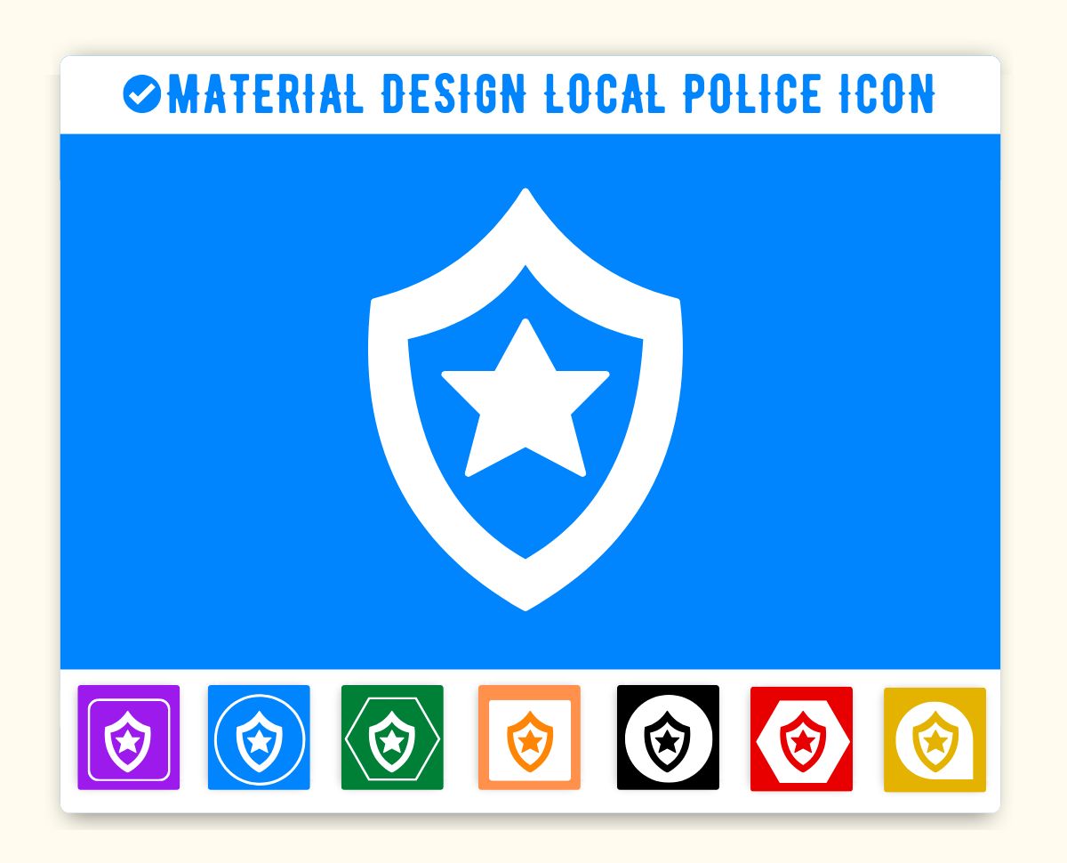 Local Police Icon is given below. You can use this icon on the same way in your project. First make sure you have added Material Icon library. If this library is added just add the HTML css class local_police to any element to add the icon. Material Design Local Police Icon can be resized as per your need. You can manage size of icon(local_police) by using font-size css style.