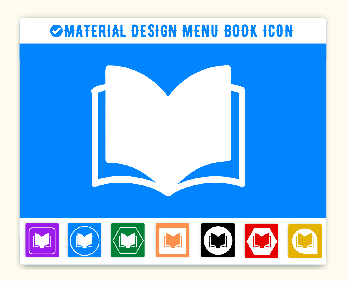 Menu Book Icon is given below. You can use this icon on the same way in your project. First make sure you have added Material Icon library. If this library is added just add the HTML css class menu_book to any element to add the icon. Material Design Menu Book Icon can be resized as per your need. You can manage size of icon(menu_book) by using font-size css style.