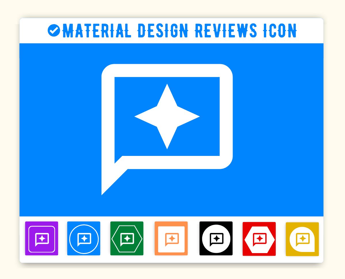 Reviews Icon is given below. You can use this icon on the same way in your project. First make sure you have added Material Icon library. If this library is added just add the HTML css class reviews to any element to add the icon. Material Design Reviews Icon can be resized as per your need. You can manage size of icon(reviews) by using font-size css style.