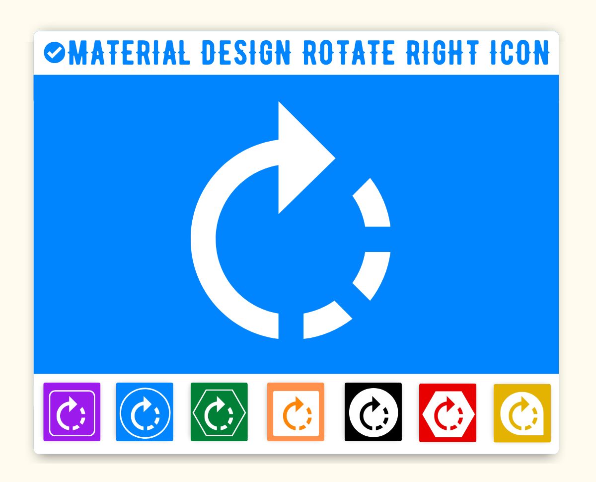 Rotate Right Icon is given below. You can use this icon on the same way in your project. First make sure you have added Material Icon library. If this library is added just add the HTML css class rotate_right to any element to add the icon. Material Design Rotate Right Icon can be resized as per your need. You can manage size of icon(rotate_right) by using font-size css style.