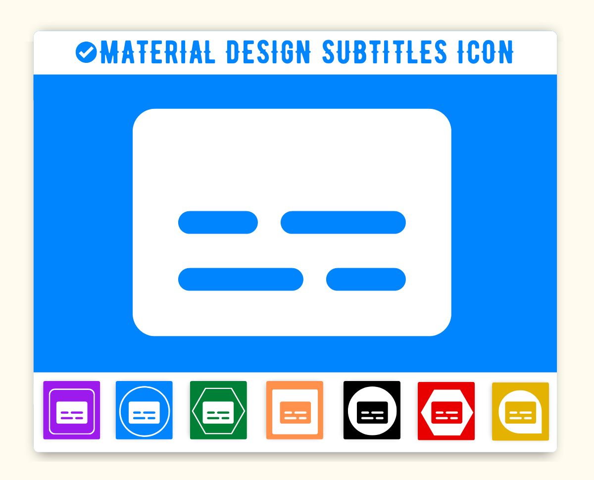 Subtitles Icon is given below. You can use this icon on the same way in your project. First make sure you have added Material Icon library. If this library is added just add the HTML css class subtitles to any element to add the icon. Material Design Subtitles Icon can be resized as per your need. You can manage size of icon(subtitles) by using font-size css style.