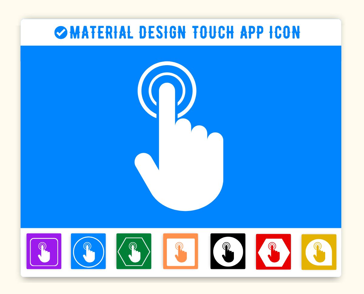 Touch App Icon is given below. You can use this icon on the same way in your project. First make sure you have added Material Icon library. If this library is added just add the HTML css class touch_app to any element to add the icon. Material Design Touch App Icon can be resized as per your need. You can manage size of icon(touch_app) by using font-size css style.