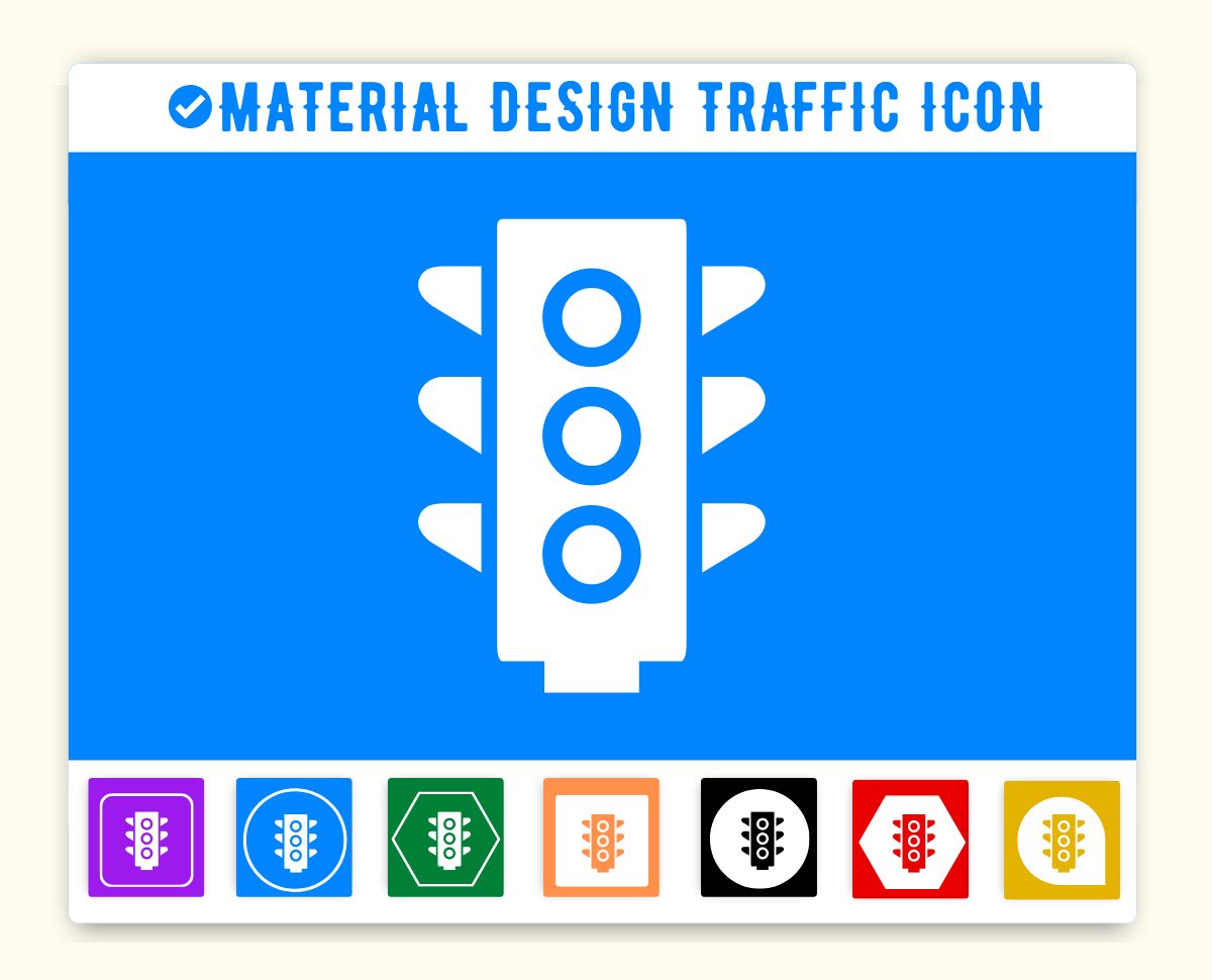 Traffic Icon is given below. You can use this icon on the same way in your project. First make sure you have added Material Icon library. If this library is added just add the HTML css class traffic to any element to add the icon. Material Design Traffic Icon can be resized as per your need. You can manage size of icon(traffic) by using font-size css style.