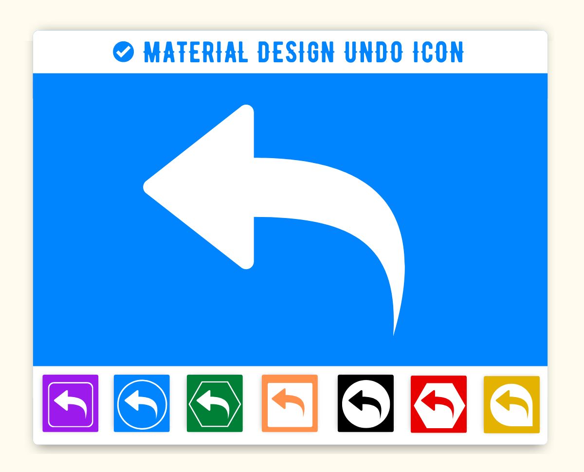 Undo Icon is given below. You can use this icon on the same way in your project. First make sure you have added Material Icon library. If this library is added just add the HTML css class undo to any element to add the icon. Material Design Undo Icon can be resized as per your need. You can manage size of icon(undo) by using font-size css style.