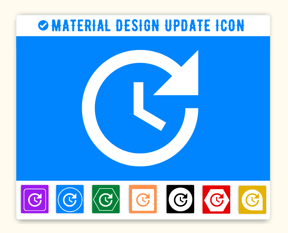 Update Icon is given below. You can use this icon on the same way in your project. First make sure you have added Material Icon library. If this library is added just add the HTML css class update to any element to add the icon. Material Design Update Icon can be resized as per your need. You can manage size of icon(update) by using font-size css style.