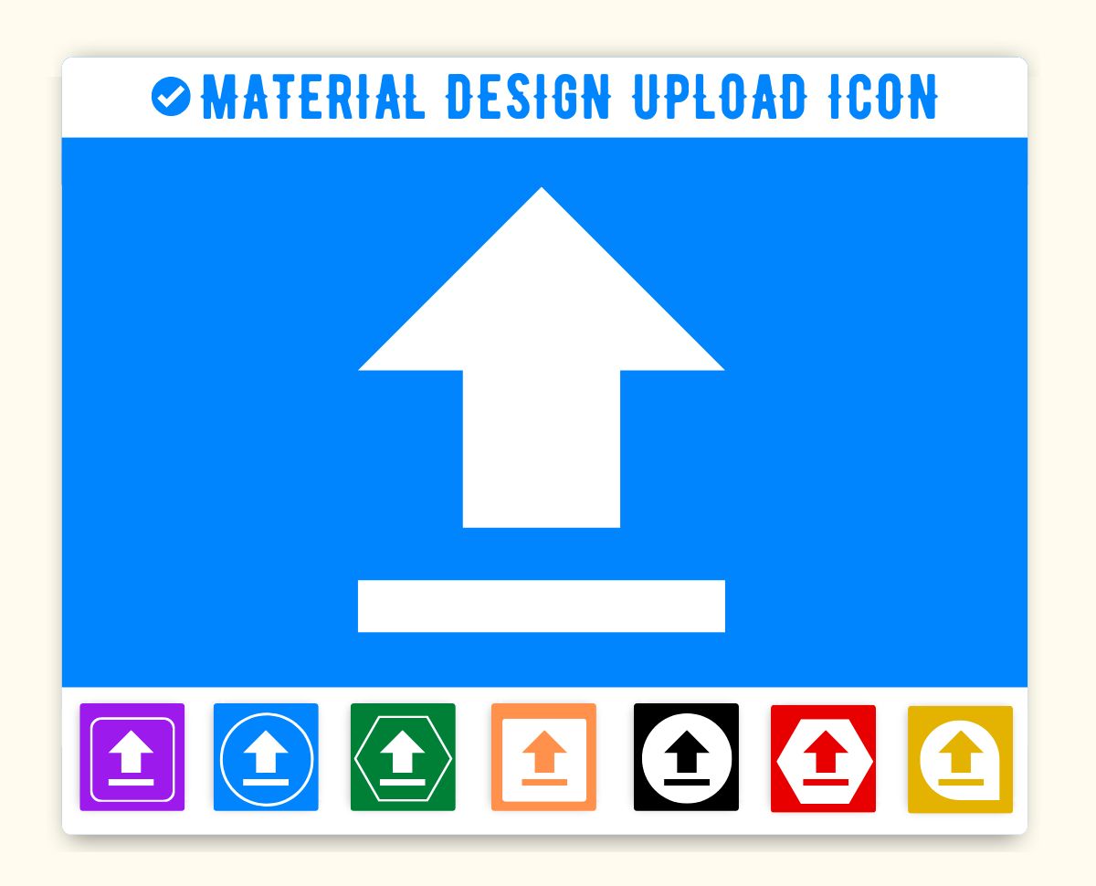 Upload Icon is given below. You can use this icon on the same way in your project. First make sure you have added Material Icon library. If this library is added just add the HTML css class upload to any element to add the icon. Material Design Upload Icon can be resized as per your need. You can manage size of icon(upload) by using font-size css style.