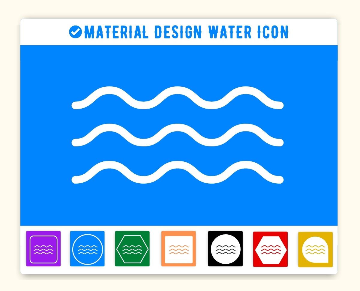 Water Icon is given below. You can use this icon on the same way in your project. First make sure you have added Material Icon library. If this library is added just add the HTML css class water to any element to add the icon. Material Design Water Icon can be resized as per your need. You can manage size of icon(water) by using font-size css style.