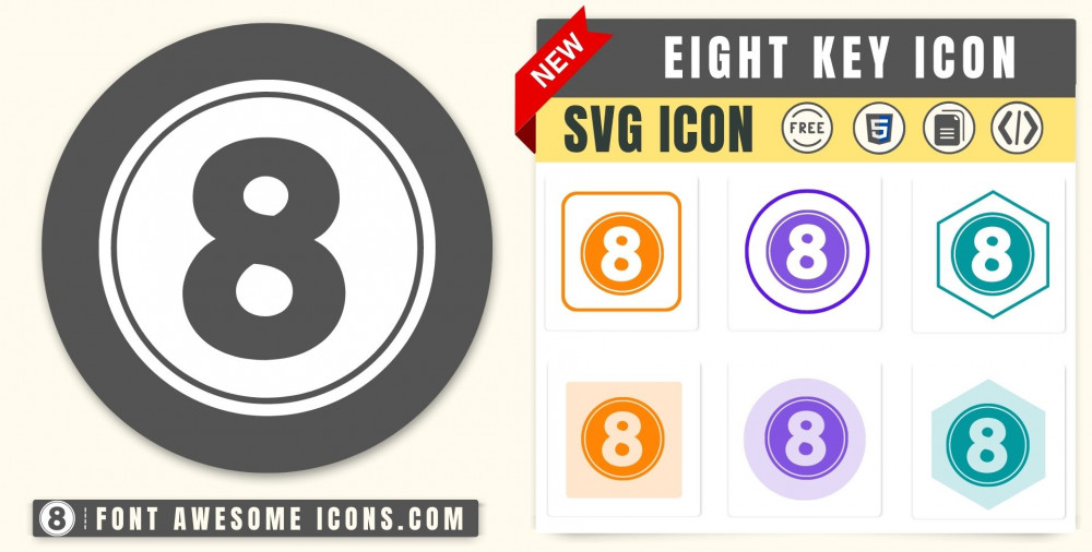 You can get svg icon eight key in blue, white, red color and transparent color from below list. You can also customize color using color picker.