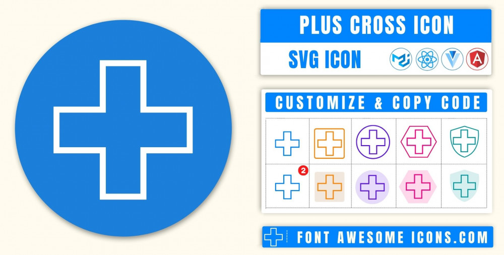 You can get svg icon plus cross in blue, white, red color and transparent color from below list. You can also customize color using color picker.